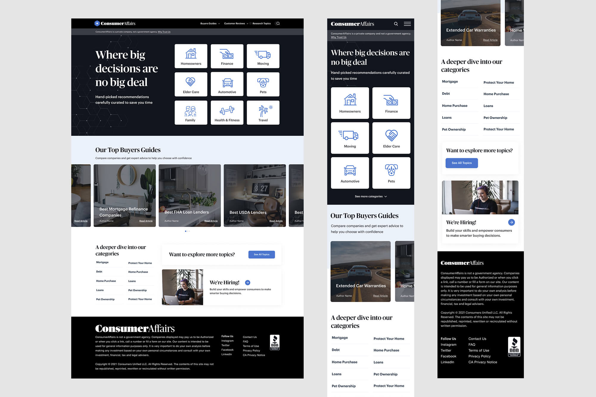 ConsumerAffairs has been around for over 20 years and has continued to add new categories, brands reviews, and educational guides to their site. However, their site was hard to navigate, so their users missed out on all the resources they offered. The site was also in need a fresh new look, so I infused their branding throughout the templates to bring more life and trustworthiness into their site. Between the site architecture changes and design refresh, we saw a significate drop in bounce rate and a higher clickthrough rate on the site.